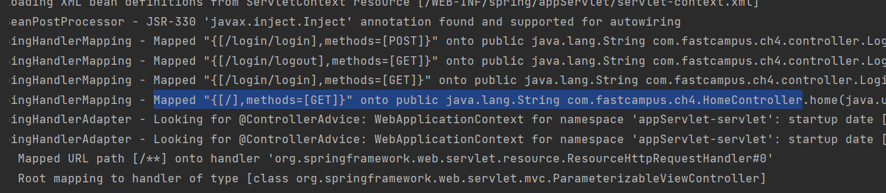 로그를 살펴보니 {/}과 {GET}이 HomeController와 맵핑되어 있었습니다. HomeConroller는 이미 삭제했는데 맵핑이 끊이지 않았ㅇ,ㅁ