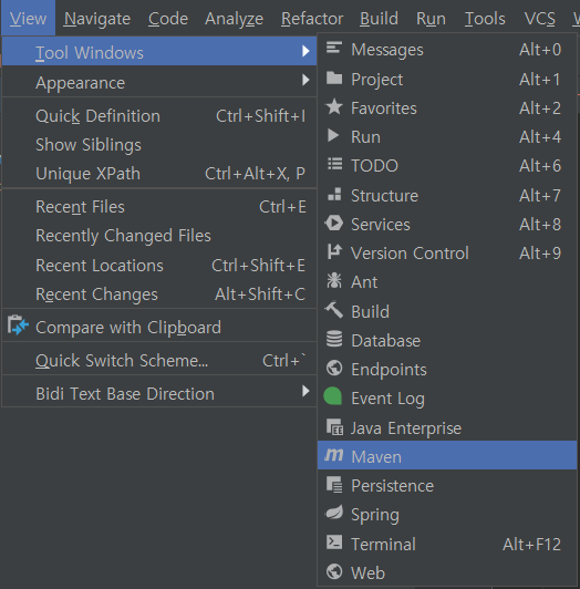 인텔리제이 상단 탭에서 View -> Maven -> clean 순으로 이동하고 실행한다. 그러면 전체 빌드내용이 삭제된다.