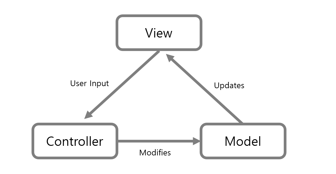 MVC란 Model-View-Controller의 약자로 애플리케이션을 세 가지 역할로 구분한 개발 방법론입니다. 아래의 그림처럼 사용자가 Controller를 조작하면 Controller는 Model을 통해 데이터를 가져오고 그 데이터를 바탕으로 View를 통해 시각적 표현을 제어하여 사용자에게 전달하게 됩니다.