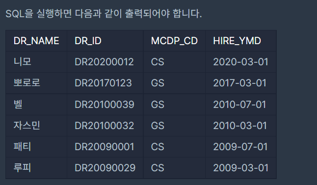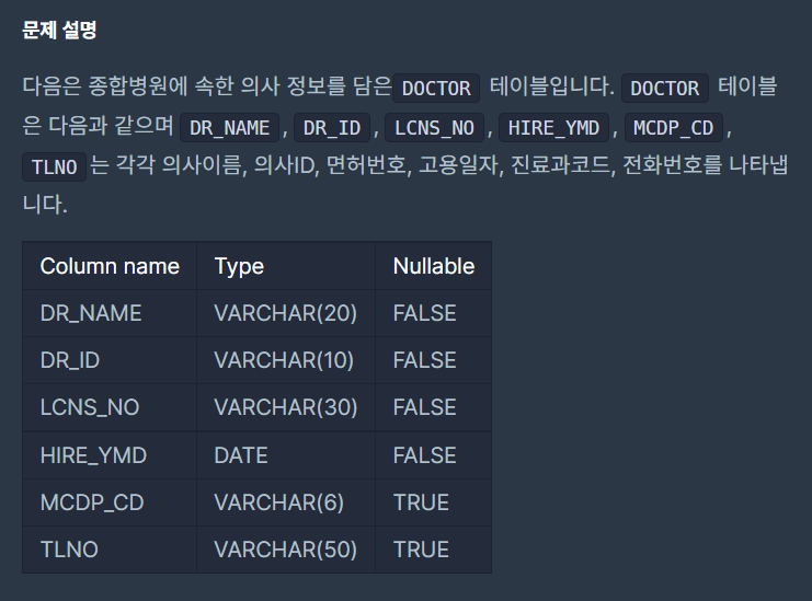 다음은 종합병원에 속한 의사 정보를 담은DOCTOR 테이블입니다. DOCTOR 테이블은 다음과 같으며 DR_NAME, DR_ID, LCNS_NO, HIRE_YMD, MCDP_CD, TLNO는 각각 의사이름, 의사ID, 면허번호, 고용일자, 진료과코드, 전화번호를 나타냅니다.