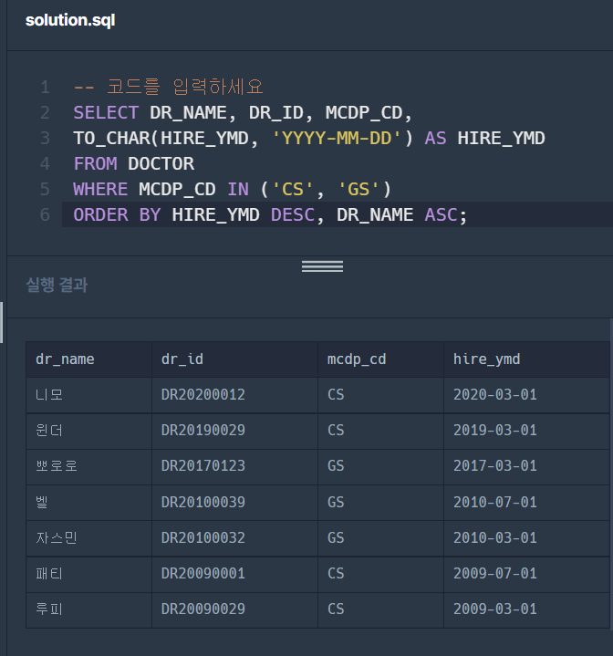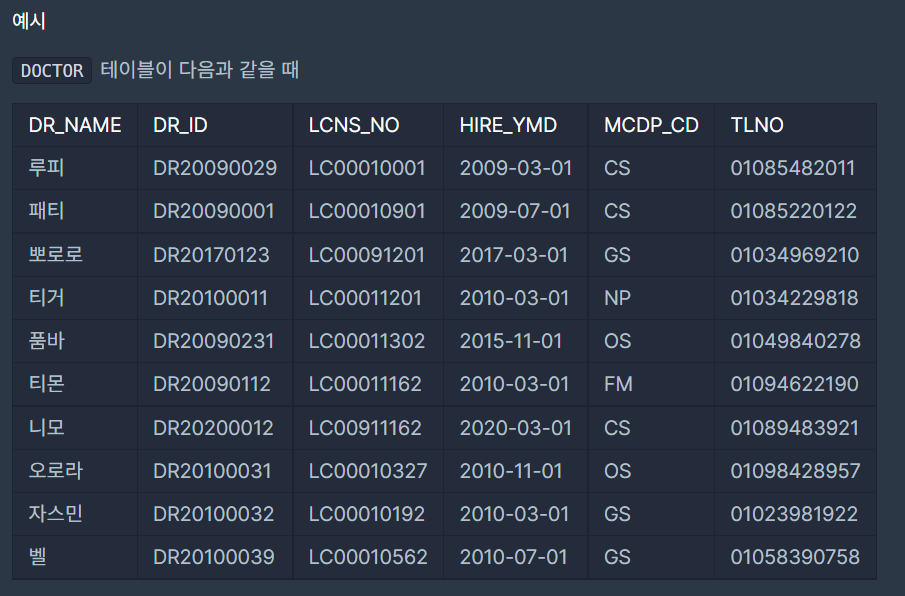 다음은 종합병원에 속한 의사 정보를 담은DOCTOR 테이블입니다. DOCTOR 테이블은 다음과 같으며 DR_NAME, DR_ID, LCNS_NO, HIRE_YMD, MCDP_CD, TLNO는 각각 의사이름, 의사ID, 면허번호, 고용일자, 진료과코드, 전화번호를 나타냅니다.