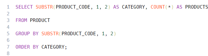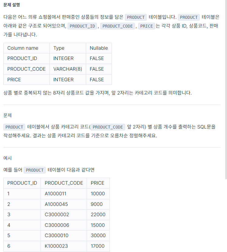 SUBSTR(PRODUCT_CODE,1,2)는 1번째부터 2자리 잘라내라 이거임