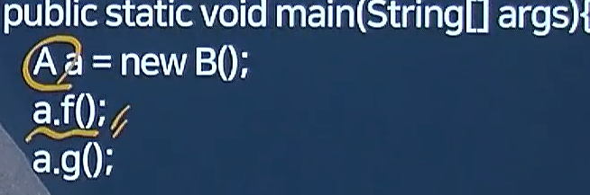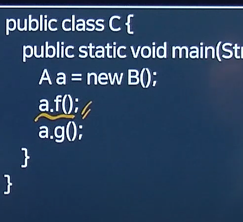 원래는 메소드 오버라이딩을 했기 때문에 B에 있는 요 f()가 호출되는게 맞아 근데