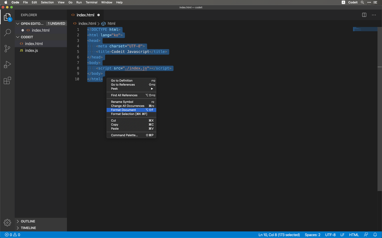 기존에 작성했던 파일로 돌아가서 단축키 Ctrl + a (맥에서는 Cmd + a)로 전체선택 해주시고 마우스 오른쪽 클릭으로 나타나는 메뉴에서 Fomat Document을 클릭해 주세요. 단축키는 Shift + Alt + F (맥에서는 Shift + Option + F)입니다.